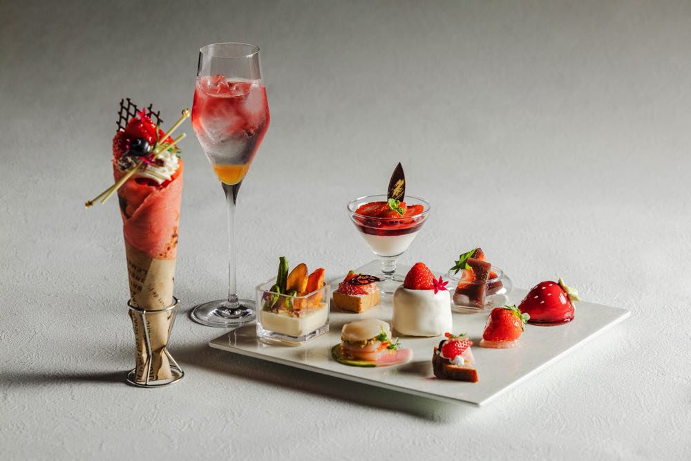 プティフールには、バレンタイン仕様の「ふわふわショートケーキ」や「ストロベリータルト」に加え、「まるごといちごの水ようかん」といった和洋の垣根を超えた個性豊かな8種類が並ぶ。またセイボリーも豪華で、フォアグラのフランやホタテのミルフィーユなど、旬の高級食材を活かしたメニューが、大人の優雅なティータイムに深みを添える。